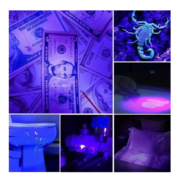 چراغ قوه UV که با عنوان چراغ قوه بلک لایت نیز شناخته میشود نوعی چراغ قوه دستی میباشد که نور ماورا بنفش با طول موج 365 تا 395 نانومتر تولید میکند. چراغ قوه ماورا بنفش کاربرد های بسیاری دارد. چراغ قوه یو وی مناسب برای تشخیص سنگ ، تست اسکناس، خشک کردن برخی جوهر ها و چسب ها، تشخیص عقرب در هنگام کمپینگ، تشخیص برخی لکه های کثیفی و چربی، یافتن محل ادرار حیوانات خانگی، آشکارسازی لکه های پنهان در خانه و بسیاری موارد دیگر کاربرد دارد. پرکاربردترین مورد مصرف چراغ قوه UV بررسی اصالت اسکناس است. از این رو این نوع چراغ گاهی با نام چراغ قوه تست اسکناس نیز شناخته میشود. همچنین نور یو وی برای خشک نمودن انواع لاک ناخن و انواع چسب که با نور یو وی پخت شده و خشک میشوند نیز کاربرد زیادی دارد. برای تشخیص اصالت سنگهای قیمتی و برخی سنگهای خاص استفاده میگردد. خشک نمودن سولدر مسک UV در بردهای الکترونیک از جمله کاربردهای دیگر آن است. افرادی در شب برای ماهیگیری از نور فرابنفش استفاده مینمایند. همچنین در شارژ نمودن رنگ شب تاب و قطعات فلورسنت کاربرد زیادی دارد و هنرمندان و صنعتگران از آن استفاده مینمایند. در کمپینگهای برای دفع حشرات ریز قابل استفاده هستند و برای تشخیص برخی اختلالات پوستی مانند قارچ و لیکن پلان نیز استفاده میشوند. بطور کلی کاربردهای نور فرابنفش بسیار زیاد است و این وسیله برای هر فرد، خودرو و ساختمانی لازم و ضروری است. همانطور که بیان شد این چراغ قوه در تعمیر و نگهداری تاسیسات و همچنین تعمیر اتومبیل کاربرد فروانی دارد و در پیدا کردن محل نشتی هوا، سانتریفیوژ، سیستم خنککننده، نفت و موارد مشابه مفید است. چراغ قوه ماورابنفش مدل uv-blacklight نیاز به سه عدد باتری نیم قلمی دارد. این نوع چراغ قوه دارای حالت چشمک زن نیز میباشد. بدنه این چراغ قوه از جنس فلز میباشد. در هنگام استفاده از چراغ قوه UV احتیاط لازم را داشته باشید و از تابش مستقیم نور آن به چشم برای مدت طولانی اجتناب کنید.