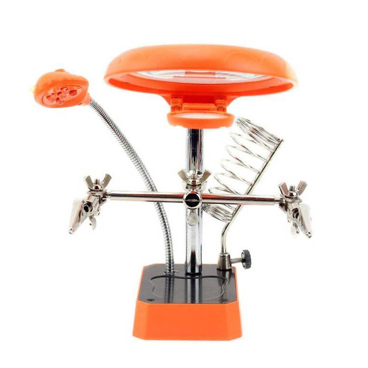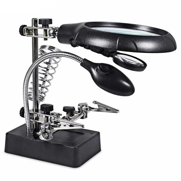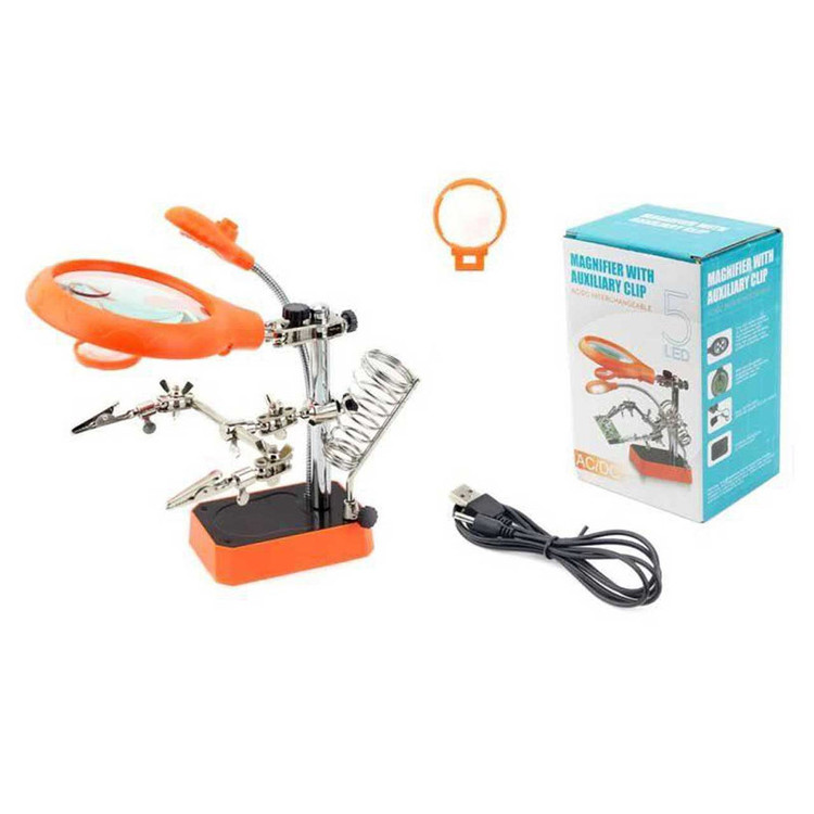 دارای 2 عدد ذره بین ، دارای محفظه نگهداری هویه دارای نور LED دارای گیره نگهدارنده برد و قطعات به همراه یک عدد آداپتور