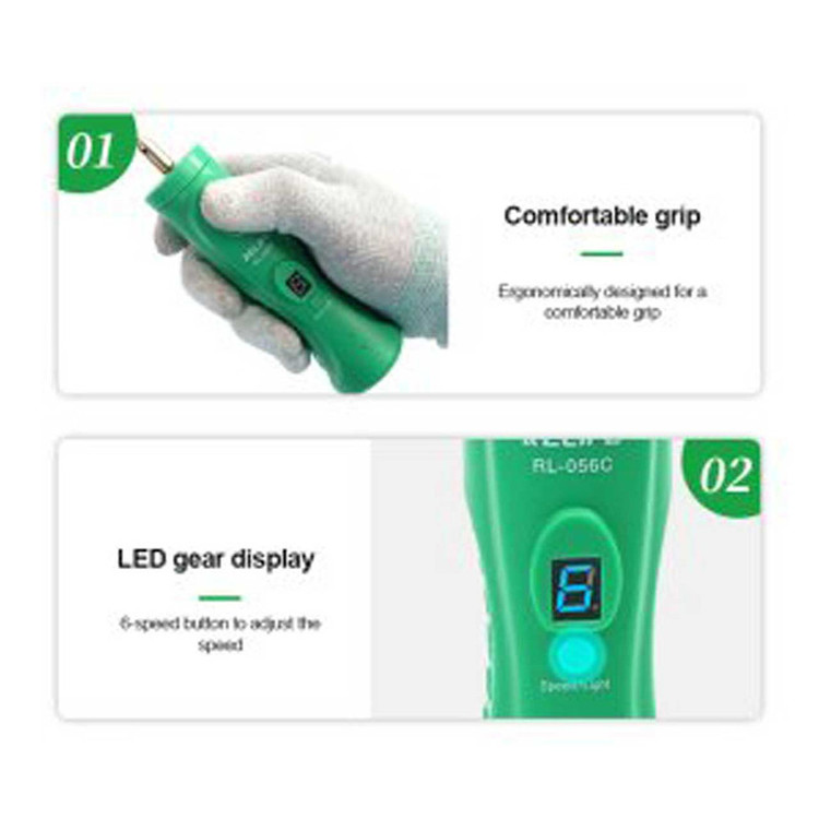 دستگاه پاک کننده و تمیز کننده چسب ریلایف مدلRL-056C با کیفیت ساخت بالا که مناسب برای پاک کردن چسب OCA و دارای باتری داخلی قابل شارژ می باشد. شارژ باتری از طریق درگاه Type-C صورت میگیرد و چرخش موتور دو حالته در جهت مختلف و دارای چراغ ال ای دی در جلوی دستگاه برای افزایش دید، قابلیت تنظیم دور موتور ، مجهز به صفحه نمایش با قابلیت نمایش میزان سرعت ، دارای نشانگر ال ای دی میزان شارژ و قابل استفاده برای تعمیرات موبایل و الکترونیک