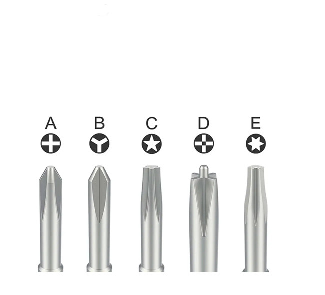چهار سو 1.5 میلیمتری و چهار سو نقطهای (پیچ بدنه آیفون)، سه پر 0.6 میلیمتری، پنج پر 0.8 میلیمتری و شش پر T2