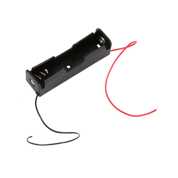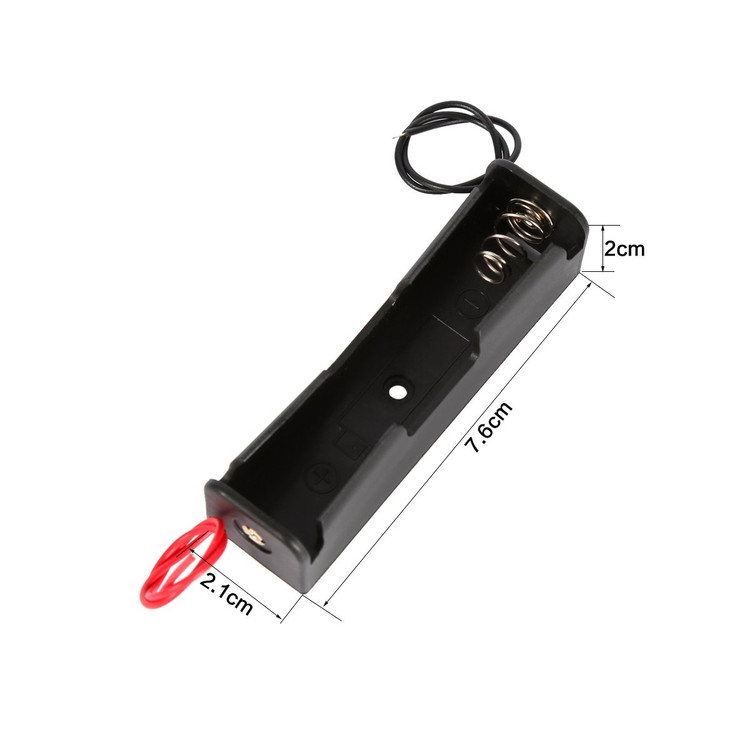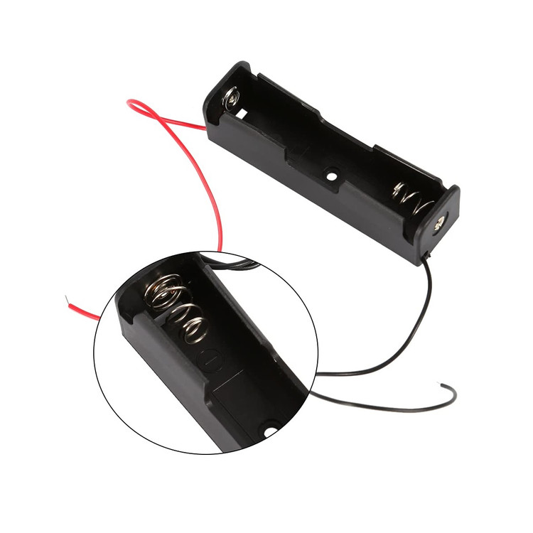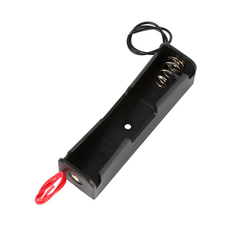 باکس و هولدر نگهدارنده انواع باطریهای لیتیومی با ابعاد ۱۸۶۵۰ مدل ۱۵ مدل تک باتری به همراه سیم قرمز مشکی طول ۱۵ سانتی متر در دو طرف کیفیت مناسب پلاستیک و فنر فلزی و پینهای استفاده شده در دو طرف دارای یک عدد جای پیچ درون باکس مناسب برای نصب بر روی لوازم الکترونیکی