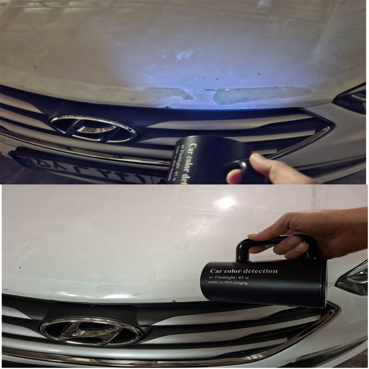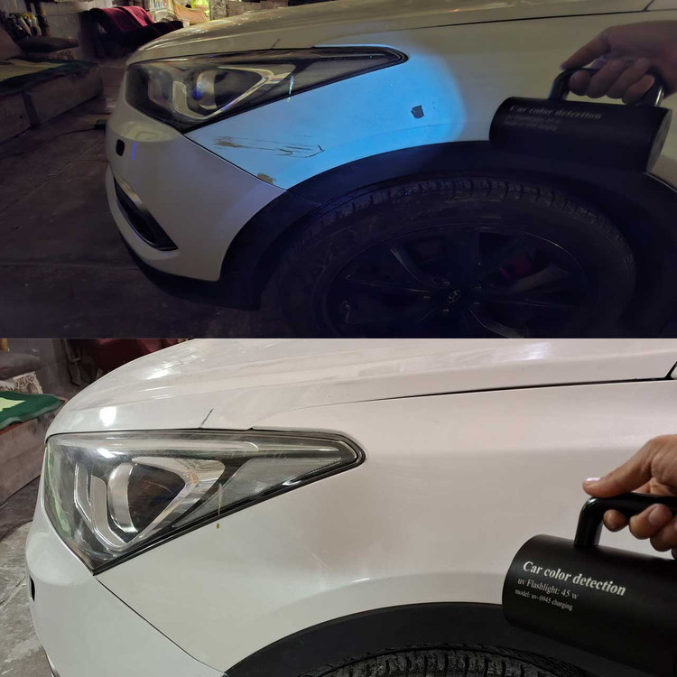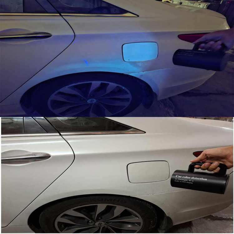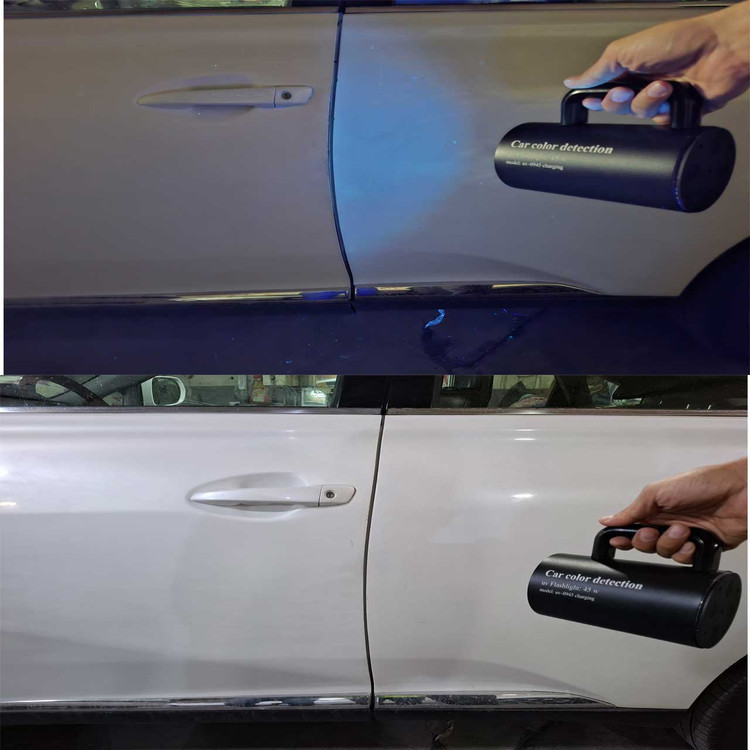 خودروي مورد نظر را در مکاني کاملا تاريک قرار داده و نور اين چراغ را روي بدنه خودرو انداخته تا رنگ شدگي يا بتونه کاري ها نمايان شود
