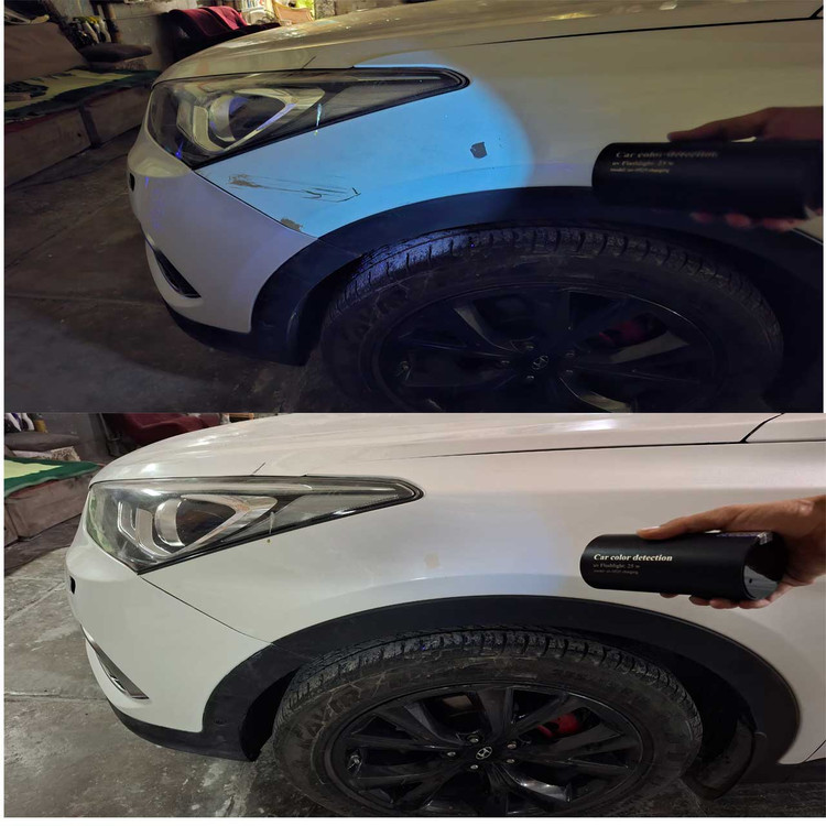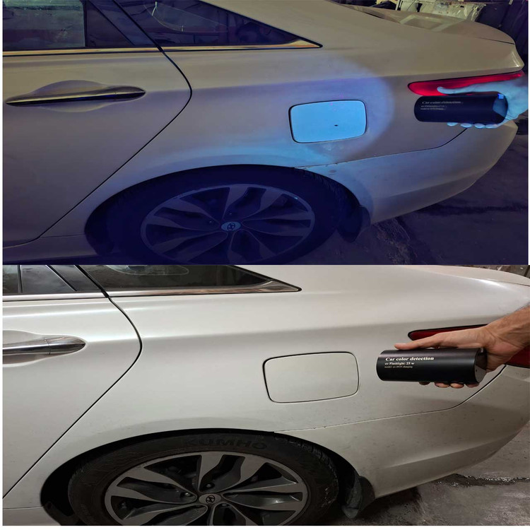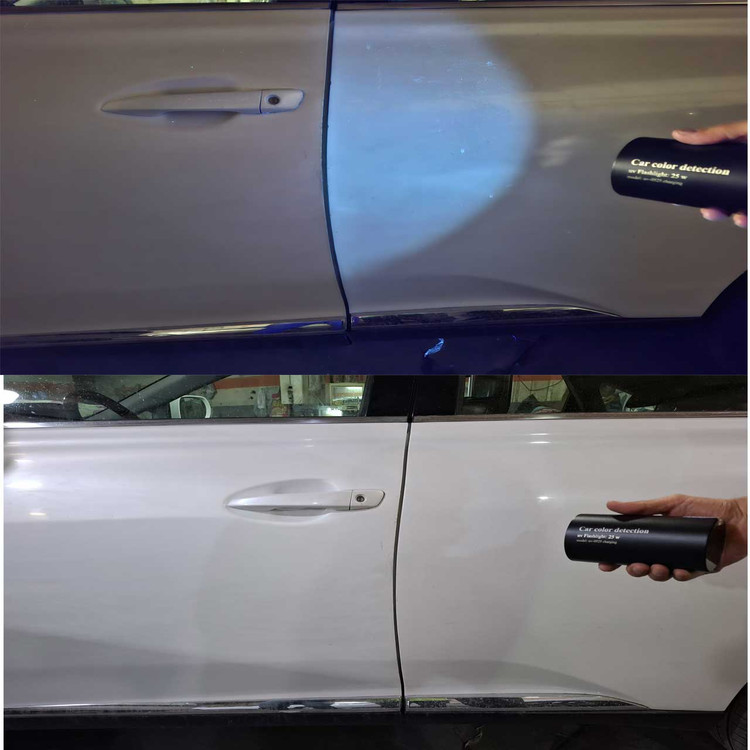 خودروي مورد نظر را در مکاني کاملا تاريک قرار داده و نور اين چراغ را روي بدنه خودرو انداخته تا رنگ شدگي يا بتونه کاري ها نمايان شود