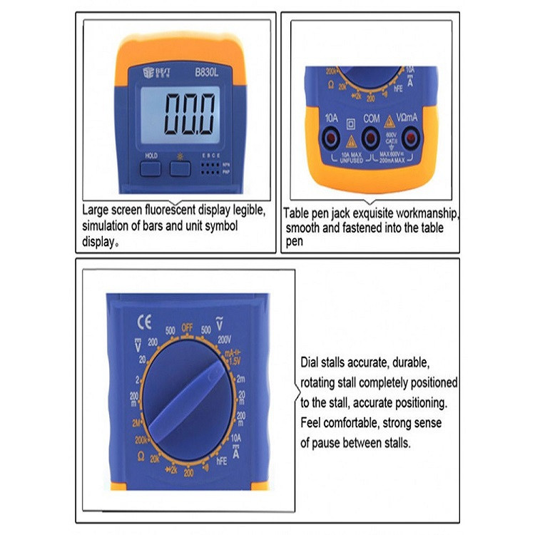 نحوه کار مولتی متر دیجیتال بدین صورت است که با پراب یا همان سیم های مولتی متر کمیت مدنظر را اندازه گیری کرده و نتیجه بر روی صفحه نمایش نشان داده میشود. ولتاژ های متناوب قابل اندازه گیری با مولتی متر B830L در بازه 200 تا 500 ولت و ولتاژ مستقیم 200 میلی ولت، 2، 20، 200 و 500 ولت و مقاومت تا 2 مگا اهم است. این دستگاه علاوه بر تست دیود و اتصال کوتاه، امکان تست ترانزیستور را هم دارد. این محصول به دلیل دقت بالا و قیمت ارزان برای کارهای آزمایشگاهی مناسب است.